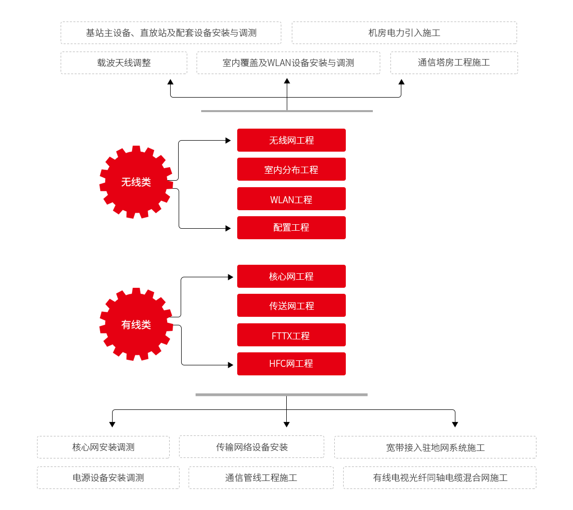 能夠提供通信建設(shè)的全專業(yè)服務(wù),業(yè)務(wù)范圍包括核心網(wǎng)工程、傳送網(wǎng)工程、FTTX工程、HFC網(wǎng)工程、無線網(wǎng)工程、室內(nèi)分布及WLAN工程等專業(yè)。施工內(nèi)容包含核心網(wǎng)設(shè)備安裝調(diào)測、電源設(shè)備安裝調(diào)測、傳輸網(wǎng)絡(luò)設(shè)備安裝調(diào)測、基站主設(shè)備安裝調(diào)試、直放站及配套設(shè)備安裝調(diào)測、室內(nèi)覆蓋及WLAN設(shè)備的安裝調(diào)測、寬帶接入駐地網(wǎng)、系統(tǒng)集成施工、有線電視光纖同軸電纜混合同施工、通信管線工程施工、載波及天線調(diào)整等;為客戶提供多元化施工解決方案,以及優(yōu)質(zhì)的全方位服務(wù)。