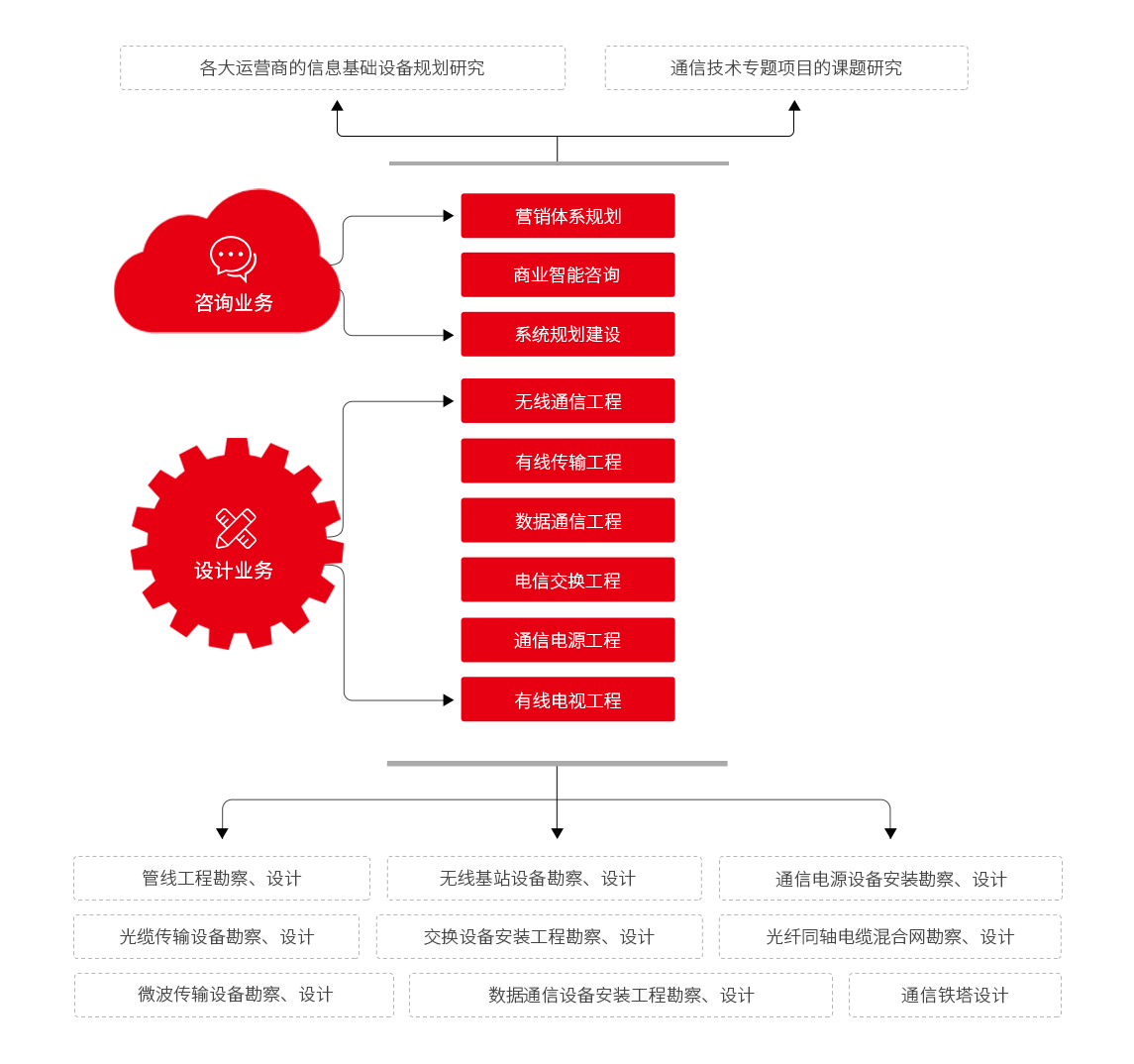為客戶(hù)提供通信網(wǎng)、計(jì)算機(jī)網(wǎng)、廣播電視網(wǎng)等網(wǎng)絡(luò)的設(shè)計(jì)咨詢(xún)服務(wù);為通信企業(yè)提供綜合發(fā)展規(guī)劃、戰(zhàn)略規(guī)劃 專(zhuān)題規(guī)劃、業(yè)務(wù)咨詢(xún)及管理咨詢(xún)等咨詢(xún)服務(wù)。公司擁有工程設(shè)計(jì)、工程勘察等國(guó)內(nèi)通信設(shè)計(jì)領(lǐng)域的頂級(jí)資質(zhì);優(yōu)質(zhì)的服務(wù)質(zhì)量,快速的業(yè)務(wù)響應(yīng)能力、標(biāo)準(zhǔn)化、規(guī)范化的服務(wù)流程以及優(yōu)秀的工程設(shè)計(jì)項(xiàng)目質(zhì)量為公司在業(yè)界取得良好的口碑。